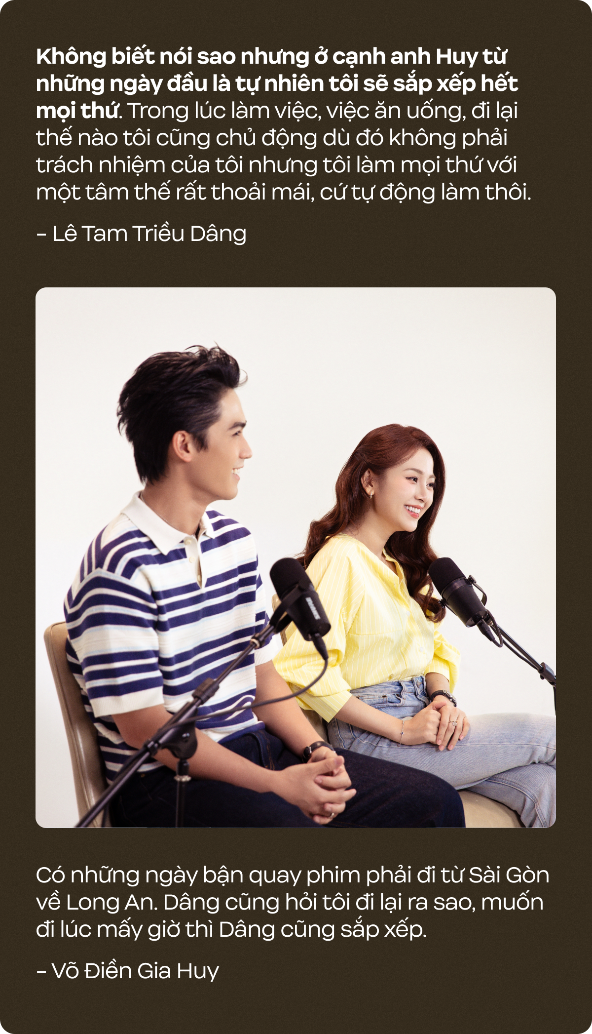 Triều Dâng: Yeah. Good job. Trước mắt, các bạn fan đều rất thích yêu thương và ủng hộ cho cả hai. Mọi người không gây áp lực gì cho cả hai hết. Chúng tôi thoải mái với nhau vì luôn sống thật với cảm xúc của mình. Những khoảnh khắc tương tác bên cạnh nhau là những điều rất bình thường của hai đứa. Chúng tôi không cố tình làm gì để mọi người chú ý về câu chuyện riêng tư hay giữ chân các bạn ở lại. Chúng tôi chỉ là chúng tôi khi tương tác với nhau một cách chân thật, dành cho nhau sự yêu mến và trân trọng. Nhận được sự ủng hộ và yêu mến từ các bạn fan dành cho Tâm và Phú là một điều may mắn.