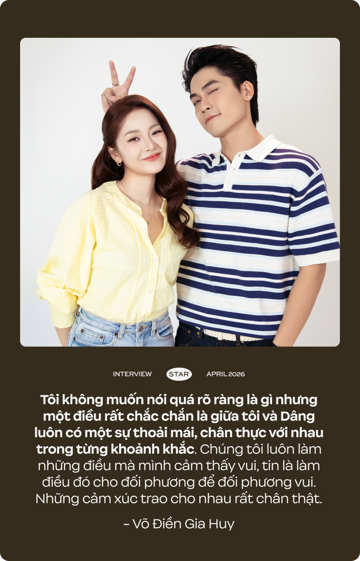 Gia Huy: Tôi hiểu được tâm lý tò mò của mọi người về mối quan hệ thực sự là gì. Thật ra tôi và Dâng là những người xuất hiện trước công chúng nhiều nên có những thứ khá riêng tư rất sợ bị mọi người bàn tán. Tôi không muốn nói quá rõ ràng là gì nhưng một điều rất chắc chắn là giữa tôi và Dâng luôn có một sự thoải mái, chân thực với nhau trong từng khoảnh khắc. Chúng tôi luôn làm những điều mà mình cảm thấy vui, tin là làm điều đó cho đối phương để đối phương vui. Những cảm xúc trao cho nhau rất chân thật.
