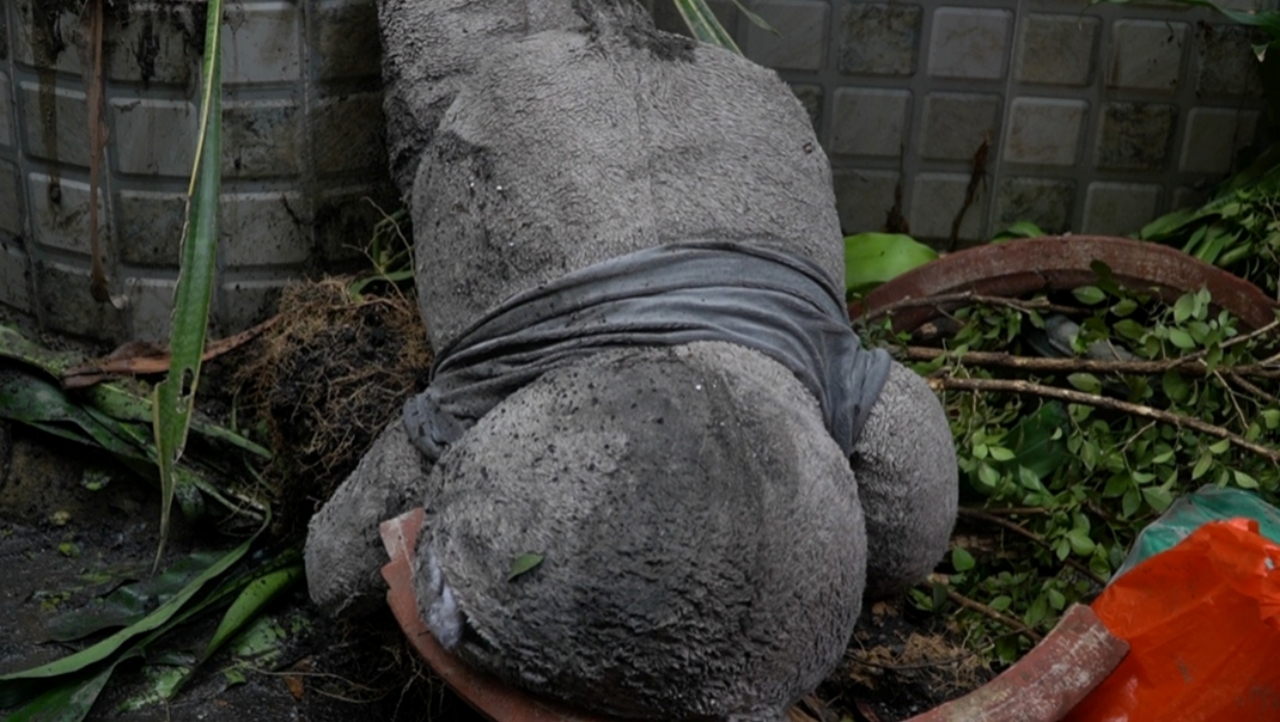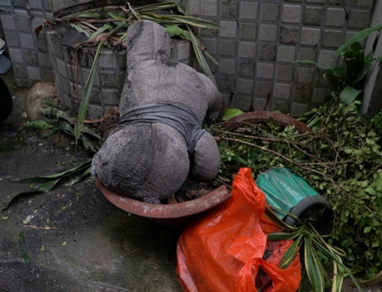 Con gấu bông nhuốm màu ám khỏi được 2 cô gái ném xuống từ tầng 3 trong lúc tìm cách thoát thân. Ảnh: Di Anh