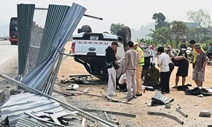 Xe bán tải đâm vào rào tôn tại khu vực thi công trên cao tốc Nội Bài - Lào Cai rồi lật ngửa, khiến một người chết, một người bị thương.