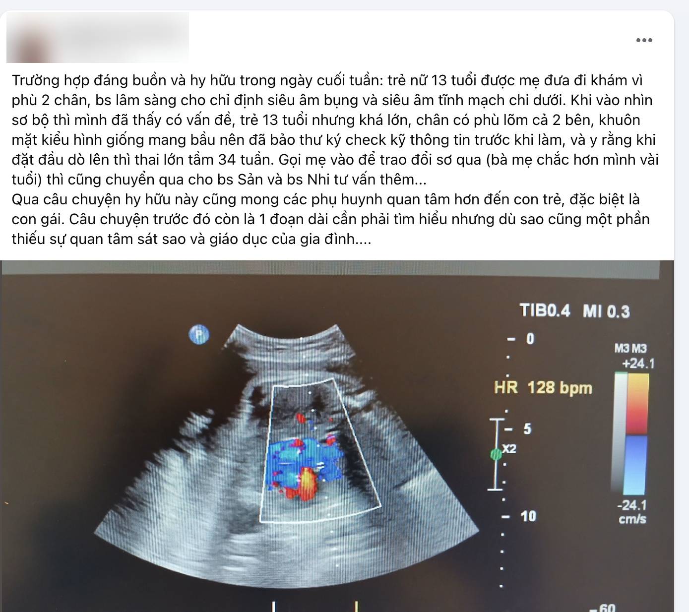 Một hình ảnh siêu âm cùng câu chuyện cảnh báo được một bác sĩ tại Hà Nội chia sẻ mới đây khiến nhiều người không khỏi giật mình. Ban đầu, bệnh nhi 13 tuổi được mẹ đưa đi khám vì phù hai chân. Những dấu hiệu lâm sàng khiến bác sĩ chỉ định siêu âm bụng và tĩnh mạch chi dưới để kiểm tra nguyên nhân. Thế nhưng, ngay khi đặt đầu dò, kết quả lại dẫn đến một phát hiện không ai ngờ tới: thai nhi đã khoảng 34 tuần, tức là chỉ còn vài tuần nữa là đến ngày sinh.