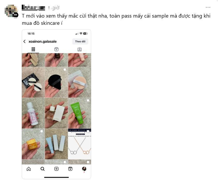 Cùng với đó, tài khoản Threads này đăng tải hình chụp bài đăng thanh lý son của Xoài Non và hoá đơn mua hàng của mình trên một sàn thương mại điện tử để chứng minh về sự chênh lệch giá.