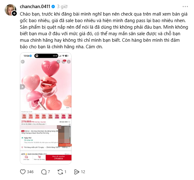 “Chào bạn, trước khi đăng bài mình nghĩ bạn nên check qua trên mall xem bán giá gốc bao nhiêu, giá đã sale bao nhiêu và hiện mình đang pass lại bao nhiêu nhen. Sản phẩm bị quệt nắp nên để nói là đã dùng thì không phải đâu bạn. Mình không biết bạn mua ở đâu với mức giá đó, có thể may mắn săn sale được và chỗ bạn mua chính hãng hay không thì chỉ mình bạn biết. Còn hàng bên mình thì đảm bảo cho bạn là chính hãng nha. Cám ơn”, Xoài Non viết.