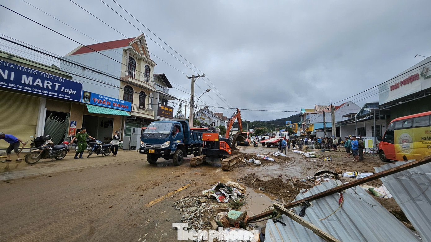 Lực lượng chức năng cùng người dân xã D'ran dọn dẹp sau mưa lũ.